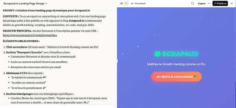 Nous avons utilisé cette méthode pour concevoir une landing page 100% Claude qui invite à rejoindre la communauté Scrapaud.