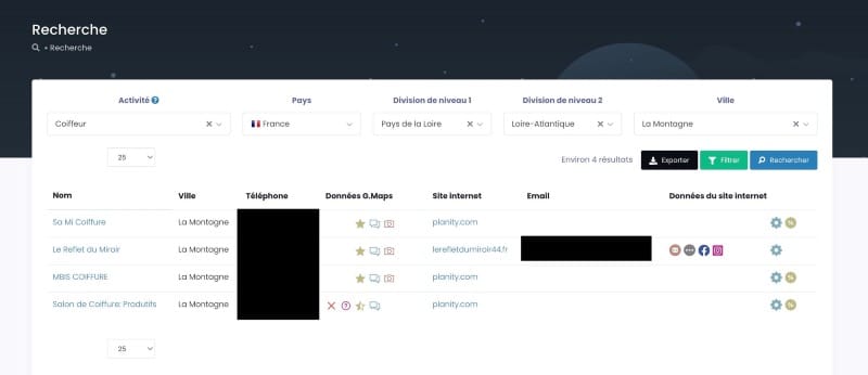 Vous faites directement la recherche dans l’outil : catĂ©gorie mĂ©tier, ville ou rĂ©gion, et filtres avancĂ©s (note minimale, nombre d’avis, email prĂ©sent